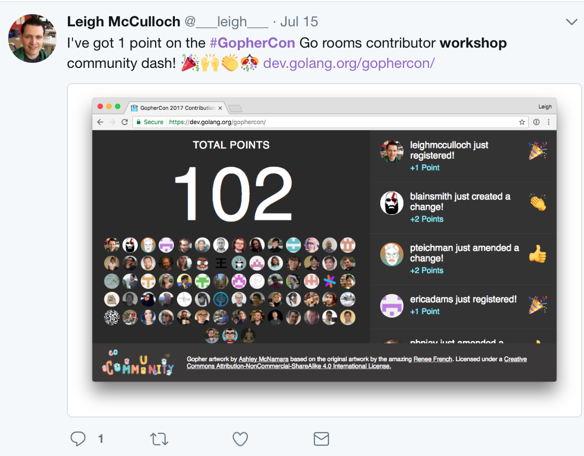 For the workshop itself, we developed a presentation “Contributing to Go,” and a dashboard / scoreboard that was presented during the event. The scoreboard was designed to encourage us all to work together towards a common goal of seeing our collective score increase. Participants added 1, 2 or 3 points to the total score when they performed actions like registering an account, making a change list (also known as a CL, similar to a pull request), amending a CL, or submitting a CL.