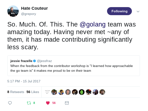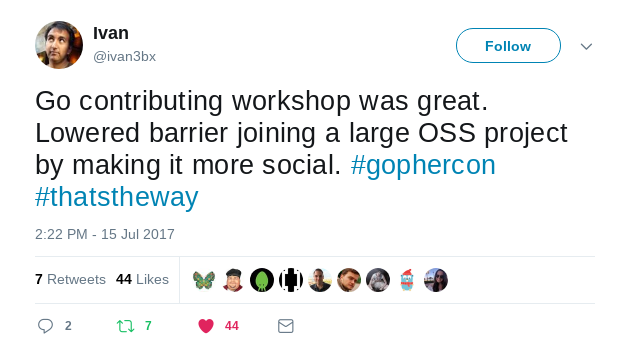 Not only were some great improvements made, but most importantly, we narrowed the gap between the core Go team and the broader community members. Many people on the Go team remarked that the community members were teaching them things about the Go project. People in the community (in person, and on Twitter) remarked that felt welcome to participate in the project.