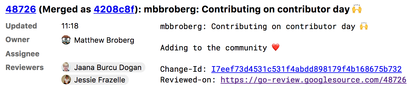 After a few months passed, I thought “enough is enough,” and decided to dedicate an entire day of an upcoming weekend to figuring out the process. I set aside all of Saturday for doing one thing: sending my first CL to Go. I opened up the Contribution Guide and started following all the steps, from the very top. Within an hour, I was done. I had sent my first CL. I was both in awe and shock. In awe, because I had finally sent a contribution to Go, and it was accepted! In shock, because, why did I wait so long to finally do this? Following the steps in the Contribution Guide was very easy, and the entire process went completely smoothly. If only someone had told me that I’d be done within an hour and nothing would go wrong, I would’ve done it much sooner!
