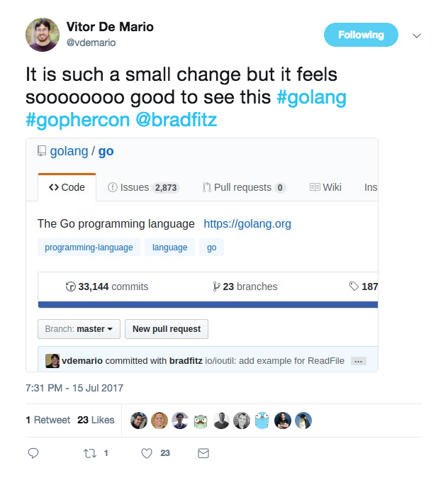 You can see my completed contribution here. What I also hope you see is how simple it is to get into the flow of contributing. If you’re like me, you’ll be good at finding a small typo or missing example in the docs to start to get used to the git codereview workflow. After that, you’ll be ready to find an open issue, ideally one tagged for an upcoming release, and give it a go. No matter what you choose to do, definitely go forth and do it. The Go team proved to me just how much they care about helping us all contribute back. I can’t wait for my next git mail.
