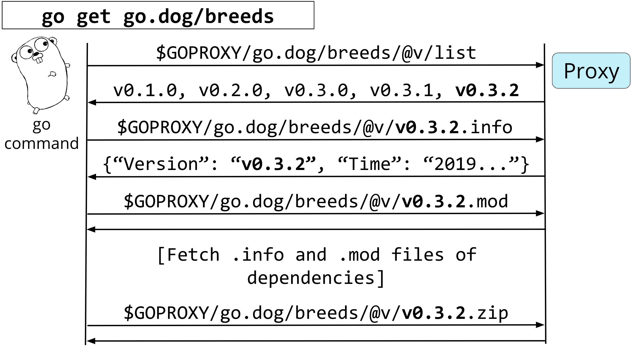The solution is to use a module proxy, which speaks an API that is better suited to the go command’s needs (see go help goproxy). When go get runs in module mode with a proxy, it will work faster by only asking for the specific module metadata or source code it needs, and not worrying about the rest. Below is an example of how the go command may use a proxy with go get by requesting the list of versions, then the info, mod, and zip file for the latest tagged version.
