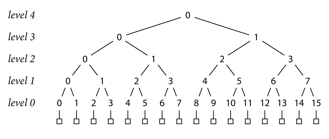 The checksum database is served by sum.golang.org, and is built on a Transparent Log (or “Merkle tree”) of hashes backed by Trillian. The main advantage of a Merkle tree is that it is tamper proof and has properties that don’t allow for misbehavior to go undetected, which makes it more trustworthy than a simple database. The go command uses this tree to check “inclusion” proofs (that a specific record exists in the log) and “consistency” proofs (that the tree hasn’t been tampered with) before adding new go.sum lines to your module’s go.sum file. Below is an example of such a tree.
