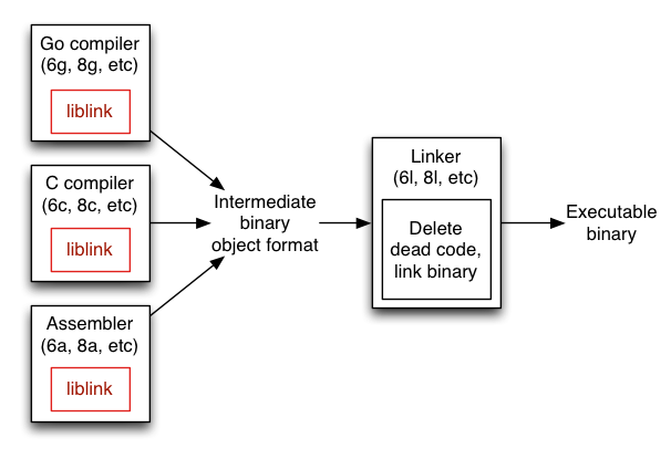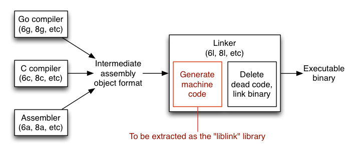 In Go 1.3, much of the old linker is moved to a liblink library that is then used by assemblers and compilers (6a, 6c, 6g, etc). This allows more work to be done in parallel.